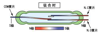 | 转换型产品,在发生外部磁场的诱导时,由于N.C侧的触点部位已被非磁性化,COM簧片将被吸引到N.O簧片侧而开始吸合。当解除外部磁场时,COM簧片再度移动到N.C簧片侧从而恢复原状。 |